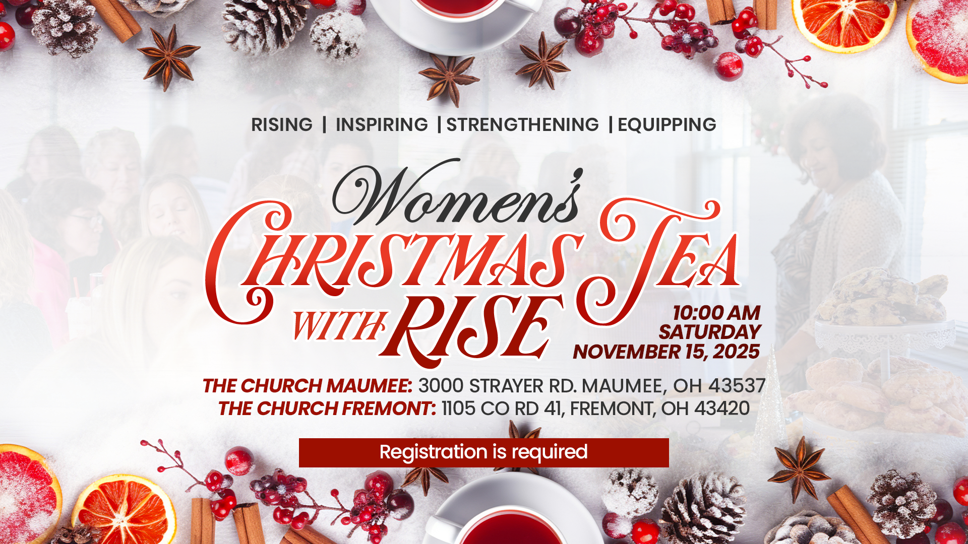 Women, start the season off right with Women’s Christmas Tea with RISE on November 15th, 2025 at 10am. You can expect a delicious brunch, tea, and friendship! *Bring your own teacup to make it more festive!